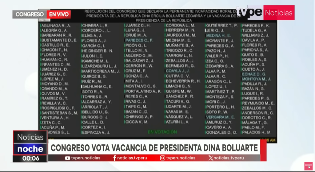 La noche del 9 de octubre de 2025 fue especialmente larga en Lima. Esa noche, el Congreso de la Republica de Perú permaneció iluminado hasta altas horas, envuelto en un ambiente de tensión y decisiones trascendentales. Los congresistas de todos los partidos, en un hecho poco común, lograron un consenso: uno tras otro tomaron la palabra para denunciar la incapacidad y la indiferencia política de la presidenta Dina Boluarte. Tras horas de debate y votación, las cuatro mociones de vacancia fueron aprobadas, y finalmente, con 122 votos a favor, 0 en contra y 0 abstenciones, el Congreso decidió destituirla de manera unánime.