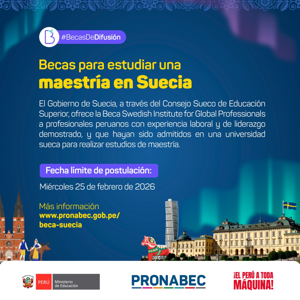 El gobierno sueco, a través del Instituto Sueco para Profesionales Globales (SI), ha iniciado el proceso de selección para su prestigioso programa de becas de maestría dirigido a ciudadanos peruanos. El Pronabec informó que las postulaciones estarán abiertas del 9 al 25 de febrero, cerrando a las 8:59 a.m. (hora peruana) del último día.